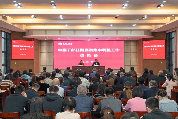11月8日下午,我校召开中层干部任期届满集中调整工作动员会,全面启动新一轮中层干部集中调整工作。校党委书记许慧霞出席并发表动员讲话,校党委副书记陈永华主持会议并作工作部署。全体校领导班子成员,中层干部,聘任制副职、学术副职,附属第一医院领导班子成员,资产经营公司负责人,教代会执委会代表,民主党派、统战团体负责人代表,正高级职称教师代表等参加大会。